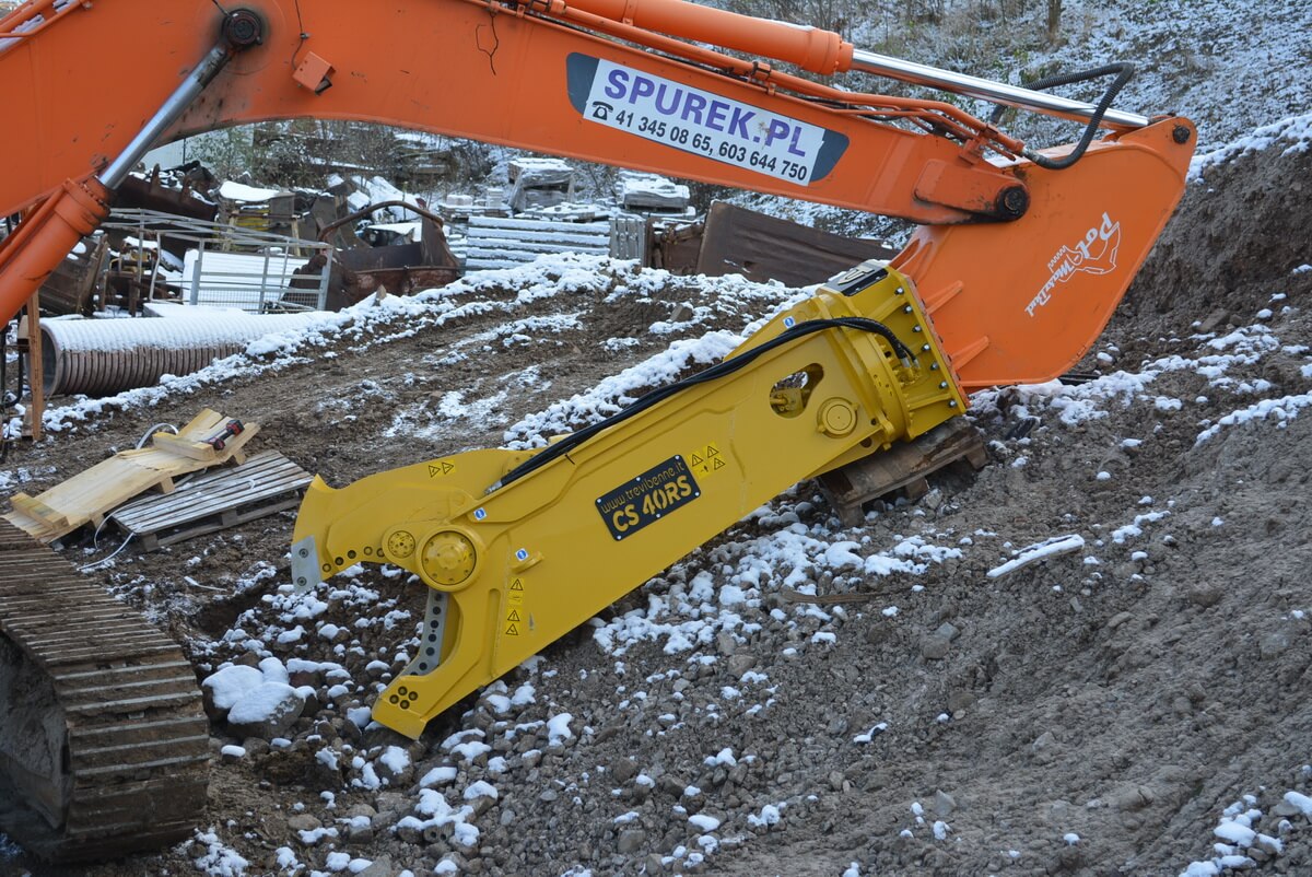 Nożyce do cięcia stali Trevi Benne CS 40 RS (4030 kg) zamontowane na ramieniu głównym koparki (boom). Zestaw nie do zatrzymania!
