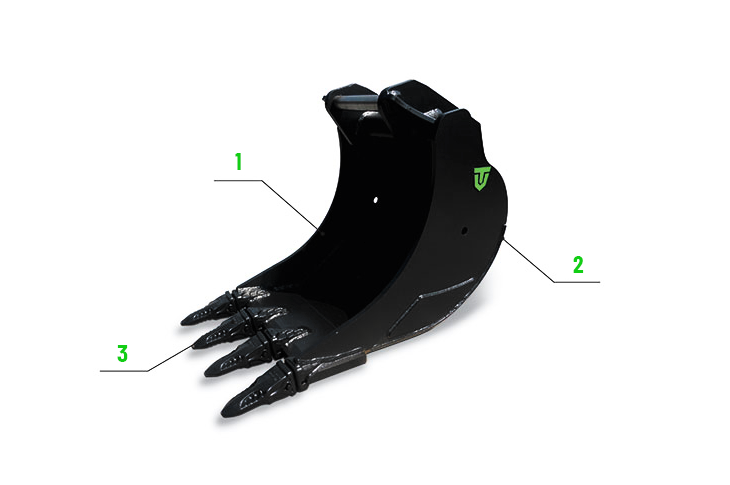 Wzmocniona struktura w miejscach narażonych na największe obciążenia i zużycie. Podwójnie uformowane wzmocnienia po bokach i na dole zapewniają wysoką wydajność w manipulowaniu zwartymi i skalistymi glebami, takimi jak porfir i piaskowiec.