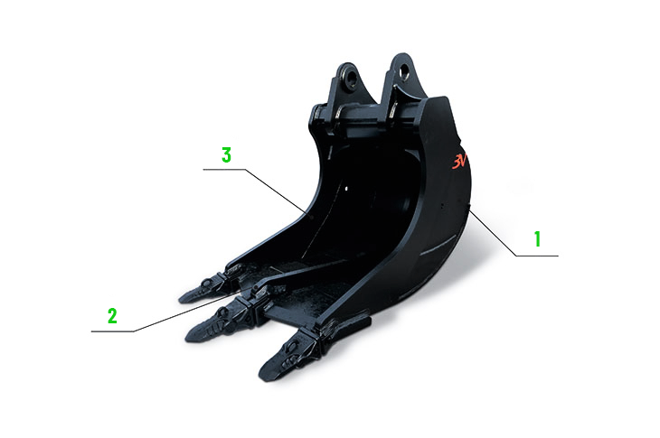 Część wewnętrzna jest wyposażona w specjalne żebro ochronne, które chroni dno łyżki przed zużyciem poprzez zsuwające się głazy.